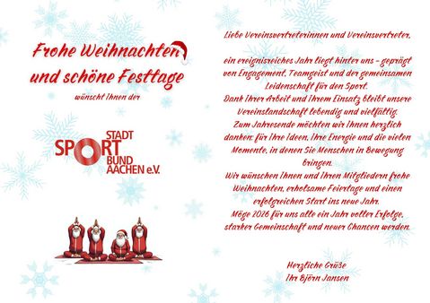 Der Vorstand und das Team der Geschäftsstelle des Stadtsportbundes Aachen e.V. wünscht Ihnen und Ihren Familien ein frohes Weihnachtsfest und einen gesunden Start in das neue Jahr.