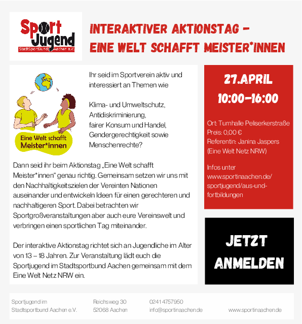 Der interaktive Aktionstag richtet sich an Jugendliche im Alter von 13 – 18 Jahren. Zur Veranstaltung lädt euch die Sportjugend im Stadtsportbund Aachen gemeinsam mit dem Eine Welt Netz NRW ein.