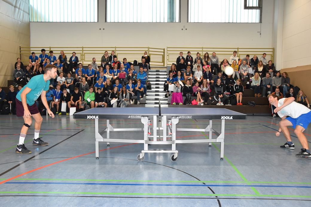 Großer Jubel drang am Morgen des 14. November aus der Sporthalle der Heinrich-Heine-Gesamtschule in Aachen als der Weltmeister im Kopfballtischtennis, Cornelius Döll, sein ganzes Können zur Schau stellte. Anlass dazu war das 1. Sporthelfer*innen-Forum in der Städteregion Aachen zu dem Rund 90 Schüler*innen und 25 Lehrer*innen aus Aachen, Baesweiler, Würselen, Bergheim, Euskirchen, Langerwehe, Erftstadt, Herzogenrath und sogar Köln angereist waren.